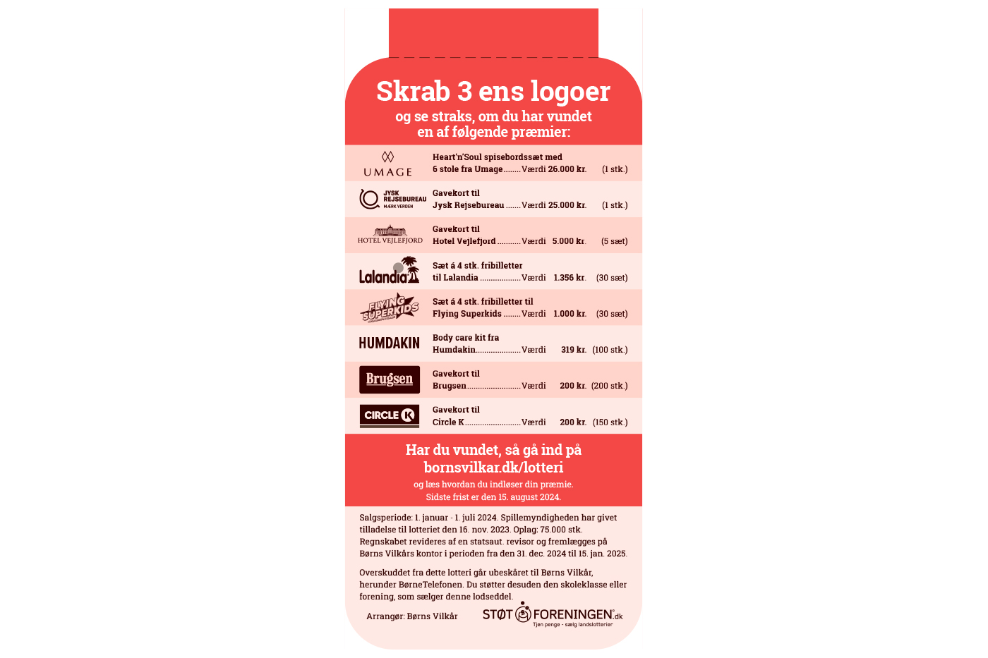 Bestil Udfyld bestillingsformularen: "*" indicates required fields 1Vælg lodder2Oplysninger3Bekræft Ordre-idHar I jeres eget design til julekalenderen?* Vi har vores eget design Vi vælger SMILfondens standard design Valgmulighed, hvis du har bestilt en julekalender med eget design* Jeg vil gerne selv designe julekalenderen Jeg har brug for hjælp til at designe julekalenderen Vælger du "Jeg vil gerne selv designe julekalendern" kan du selv designe julekalenderen og indsætte foto, logoer og tekster. Vælger du "Jeg har brug for hjælp til at designe julekalenderen", så laver vi opsætningen af julekalenderen for dig og vi fremsender en korrektur til dig for godkendelse.Upload filer til brug for tryk af jeres lokale julekalender Upload jeres logo, foto og sponsorers logoer her. Fotoet skal være i en god kvalitet for tryk og min. 200 DPI, ligesom logoer skal være i trykkvalitet. Vi kan også påtrykke en kort tekst - Skriv denne i kommentarfeltet. BEMÆRK: Kun muligt ved bestilling af min. 300 stk. Vi fremsender korrektur til godkendelse inden tryk - Max. 1 korrekturgang er inkl. i prisen og fremsendte korrektur skal godkendes inden for 3 dage efter modtagelsen. Ved spørgsmål - send en mail til lotteri@bording.dk eller ring til os på 6015 1799Logo* Drop files here or Select files Accepted file types: jpg, png, Max. file size: 5 MB, Max. files: 1. Baggrundsbillede* Drop files here or Select files Accepted file types: jpg, png, Max. file size: 5 MB, Max. files: 1. Sponsorlogo* Drop files here or Select files Accepted file types: jpg, png, Max. file size: 5 MB, Max. files: 4. Klik for at vælge et design Her kan du se det standard design vi har på julekalenderne. Bagside af julekalender og gevinster er de samme for alle typer julekalendere. Vælger du et standard design kan vi ikke påtrykke foto, logo og tekst - de leveres som de vises her.Standarddesign Standarddesign Bemærk: Som frivillig er det t ikke muligt at tjene penge gennem salg af DEMOLOTTERIET. Overskuddet går ubeskåret til sagen. Vi takker for støtten og indsatsen.Vælg antal lodderMED returret Quantity Price: 20,00 kr. Quantity {step:20, min:20, max:20*15, c_step:300, c_min:300, c_max:300*10} Bestillers navn*Email* Telefonnr.*Bestillers adresse*Bemærk, at bestillers adresse skal stemme overens med det navn, der er registreret i folkeregisteret, for at vi kan gennemføre din bestilling. Vej og nr. By Postnummer Ønsker du at angive en anden leverings adresse? Ja tak Alternativ leveringsadresse* Vej og nr. By Postnummer Evt. kommentar til din bestillingConsentForHasReturnRight* Vi bestiller {hasReturnRightValue} stk. skrabelodder MED returret og vi tjener ikke selv på salget. Vi afregner med 50 kr. pr. solgt lodseddel og du kan frit returnere eventuelt usolgte lodsedler.*ConsentForAge* Jeg er den ansvarlige for lotteriet og jeg er fyldt 18 år. Jeg er ikke registreret i RKI. Jeg er økonomisk ansvarlig for de udleverede lodder. Den eneste undtagelse er tyveri/brand, hvor der foreligger en politianmeldelse. Endvidere forbeholder Bording Danmark og DEMOLOTTERIET sig retten til at tjekke bestiller i RKI.*ConsentForContact* Jeg accepterer at Bording Danmark og DEMOLOTTERIET må sende informationer til mig omkring lotterier og fundraising produkter på sms, mail eller kontakte os pr. tlf. Du kan til enhver tid afmelde dig denne service ved at følge afmeldingsteksten du modtager - enten i SMS eller i MAIL.*Total